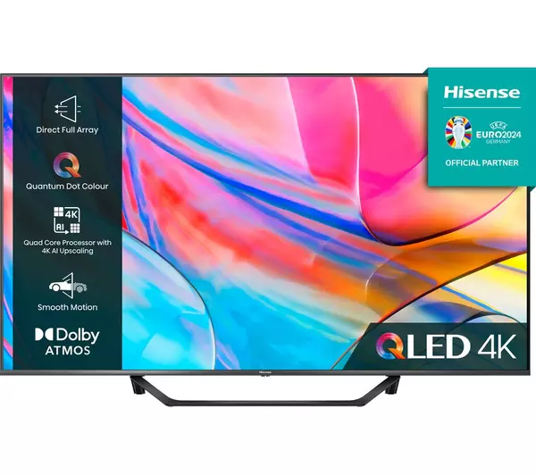 Up your movie night game with this Hisense A7KQ TV. Its 4K QLED display uses Quantum Dot technology, so every scene is bursting with a billion different colours and hues. Those classics will look better than ever. With Dolby Vision HDR, you get deeper blacks, brighter whites and true-to-life colours, so you’ll be able to pick out even the smallest of details. And for sound that matches the picture, pair this telly with Dolby Atmos speakers to create an immersive surround sound effect. Whether the scene is playing out in a busy marketplace or on a distant planet, you’ll feel like you’re right there.